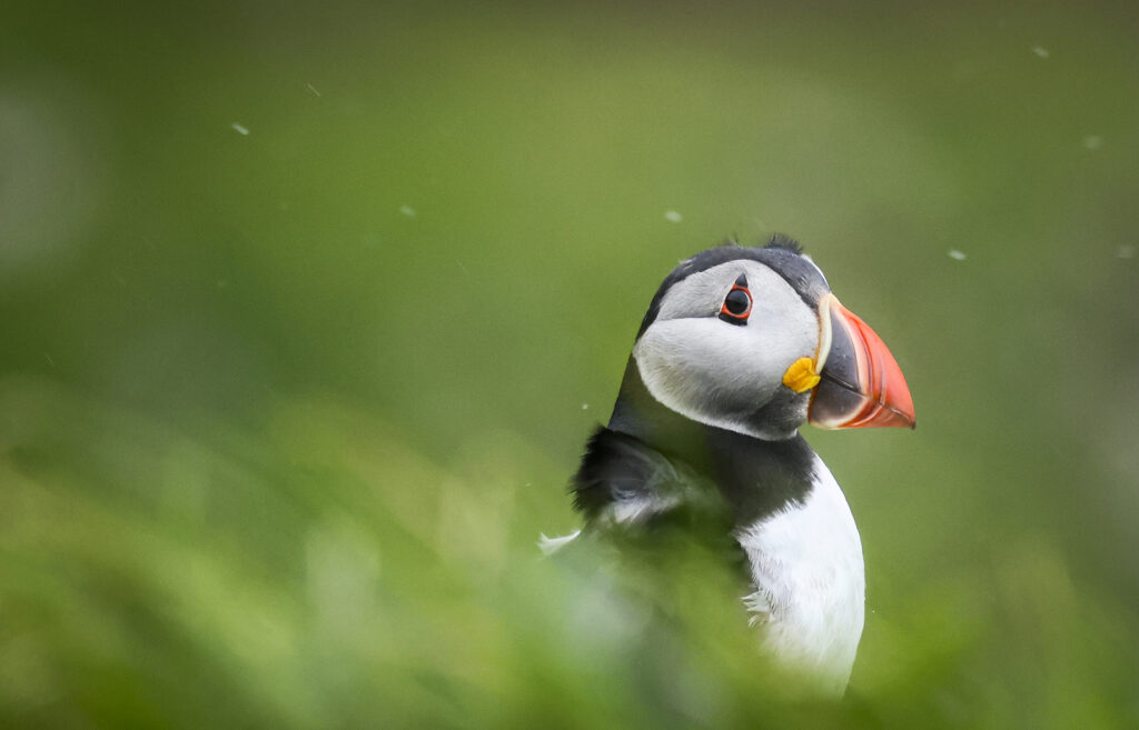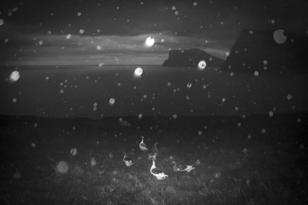 Maskonury, czarne barany, owce w najmniej oczekiwanych miejscach i konfiguracjach. Kolorowe ściany domów, dachy pokryte trawą, bezkresna woda, z której tu i ówdzie wystają zadziwiające kształty skał. Przestrzeń, deszcz, ocean, wiatr. Dużo wiatru! Miejsca do których nawet dzisiaj nie jest łatwo dotrzeć, jak wyspa Stora Dimun, na której mieszka tylko jedna rodzina. Przedstawione w oszczędnej czerni, bieli i szarości, lub zaskakujące krzykliwą czerwienią dziobów i łap, i zielenią trawy.